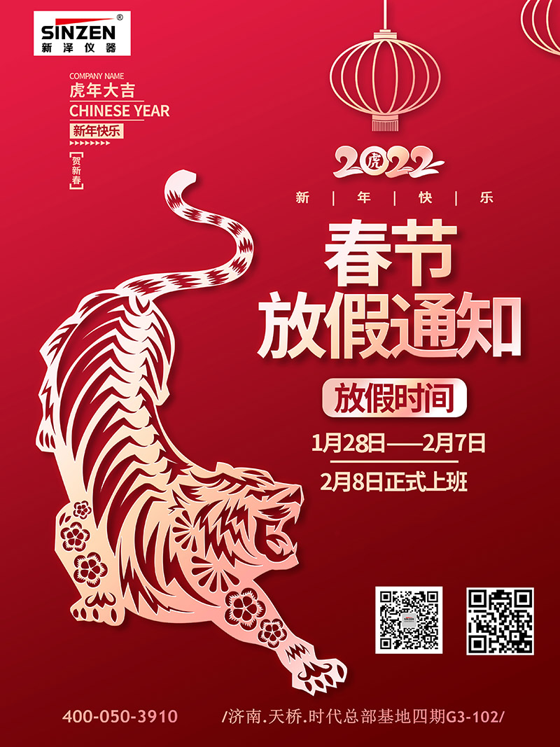 我公司將在2022年1月28日至2月7日放假,2月8號正式上班,在此期間如有問題可咨詢:400-050-3910 非常感謝大家的支持與鼓勵!山東新澤儀器有限公司全體員工祝您春節假期愉快!萬事如意!