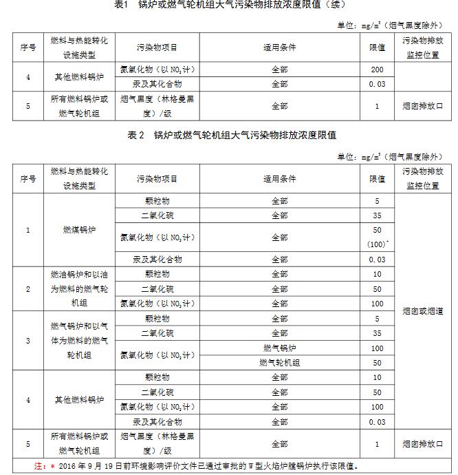 4.22016年9月20日起至本標(biāo)準(zhǔn)實施之日前環(huán)境影響評價文件通過審批的燃煤鍋爐,2017年1月1日起至本標(biāo)準(zhǔn)實施之日前環(huán)境影響評價文件通過審批的燃油鍋爐和以油為燃料的燃?xì)廨啓C組、燃?xì)忮仩t和以氣體為燃料的燃?xì)廨啓C組以及其他燃料鍋爐,新建鍋爐或燃?xì)廨啓C組,自本標(biāo)準(zhǔn)實施之日起執(zhí)行表2中的排放濃度限值。