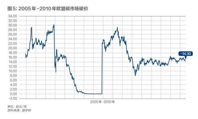 歐盟碳交易起始價(jià)較高,2005年初從15歐元/噸價(jià)位迅速上漲到28歐元/噸。但在2006年4月底,由于核查排放數(shù)據(jù)泄露,并顯示發(fā)放給成員國的碳配額總數(shù)遠(yuǎn)高于實(shí)際排放,碳配額嚴(yán)重過剩。導(dǎo)致每噸碳價(jià)從30歐元暴跌至10歐元。此后,由于配額不能存儲(chǔ)到下一階段導(dǎo)致碳價(jià)繼續(xù)暴跌,到2007年底接近零。