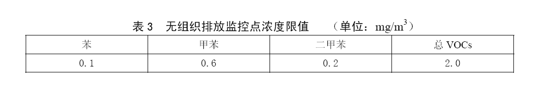 無(wú)組織排放應(yīng)執(zhí)行表3的無(wú)組織排放監(jiān)控點(diǎn)濃度限值。