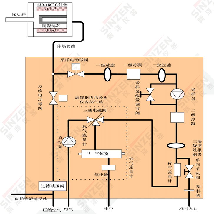 樣氣通過(guò)取樣探桿進(jìn)入到取樣探頭內(nèi),經(jīng)過(guò)陶瓷濾芯過(guò)濾后,除去樣氣中的粉塵;取樣探頭通過(guò)加熱器加熱到120°C~150°C,防止樣氣在經(jīng)過(guò)取樣探頭后,產(chǎn)生冷凝水。來(lái)自采樣探頭的樣氣經(jīng)高溫伴熱管線,通過(guò)二級(jí)過(guò)濾器除塵,經(jīng)過(guò)兩級(jí)冷凝系統(tǒng)除水后直接進(jìn)入分析儀內(nèi)測(cè)量氣體室,氣體室放置于分析儀內(nèi),通過(guò)紫外光纖連接到紫外差分分析儀,實(shí)現(xiàn)對(duì)煙氣的測(cè)量,最后通過(guò)采樣泵將被測(cè)煙氣排空;冷凝下來(lái)的水經(jīng)排水系統(tǒng)排掉。由控制單元實(shí)現(xiàn)自動(dòng)反吹、自動(dòng)標(biāo)定、制冷溫度報(bào)警提示等功能,并顯示系統(tǒng)的各種工作狀態(tài)。